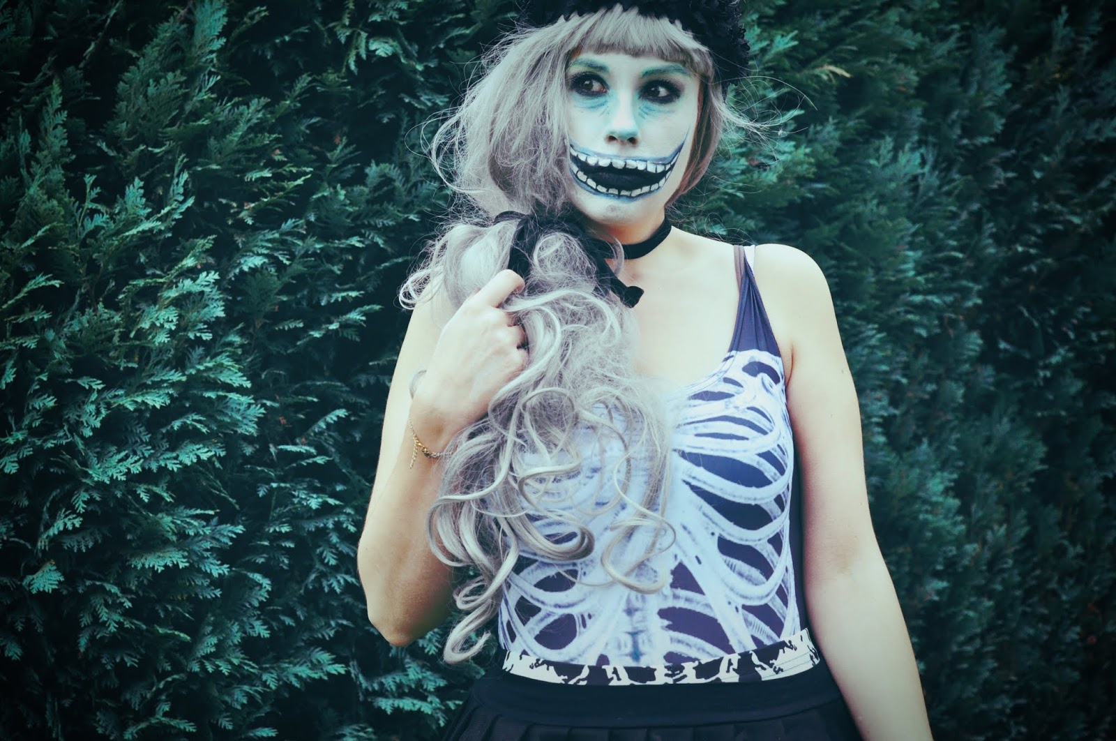 Je suis vraiment très fan de Tim Burton. Et pour Halloween, son univers m'inspire toujours beaucoup. Souvenez-vous, il y a quelques années, je m'étais déguisée en une Beetlejuice girl et puis, mon préféré, une Emily des "Noces Funèbres" avec ce costume 100% home made. Il y a tellement de personnages que j'aimerais recréer! Cette fois-ci, c'est à "L'Etrange Noël de Mr Jack" que je me suis attaquée. Comme j'avais tout sous la main, j'ai donc fait une version personnelle de Gram (ou Barrel pour sa version anglaise), l'un des membres du trio Am, Stram et Gram (Lock, Shock et Barrel), les acolytes d'Oogie Boogie. Tout comme la Beetljuice girl, c'est un déguisement que j'ai adapté à ma sauce. Je suis loin d'être une make-up artiste (d'autant que j'ai du speeder pour éviter qu'il ne fasse trop noir et qu'il ne pleuve) mais je dois dire que ça m'amuse toujours beaucoup. Bref, j'espère que ce petit déguisement rapide vous plaira!